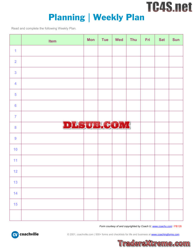 Planning Chart Weekly Plan 15 Items 2 - JPG Image File