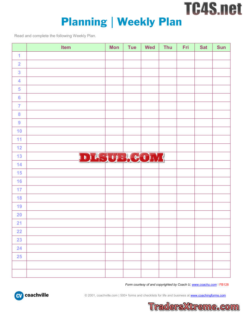 Planning Chart Weekly Plan 25 Items - JPG Image File