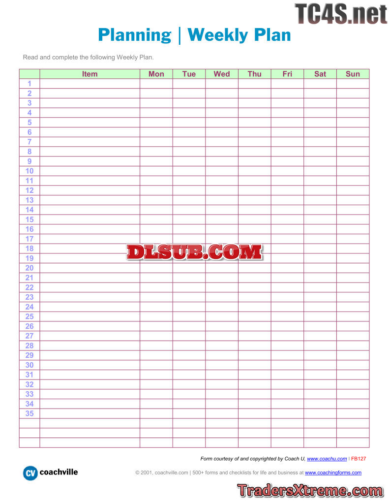 Planning Chart Weekly Plan 35 Items - JPG Image File